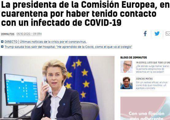 《20分钟报》报道,欧盟理事会主席Ursula von der Leyen通过推特宣布,鉴于自己先前跟一位已经确诊新冠的人士有过会面,目前她自己也在隔离中。