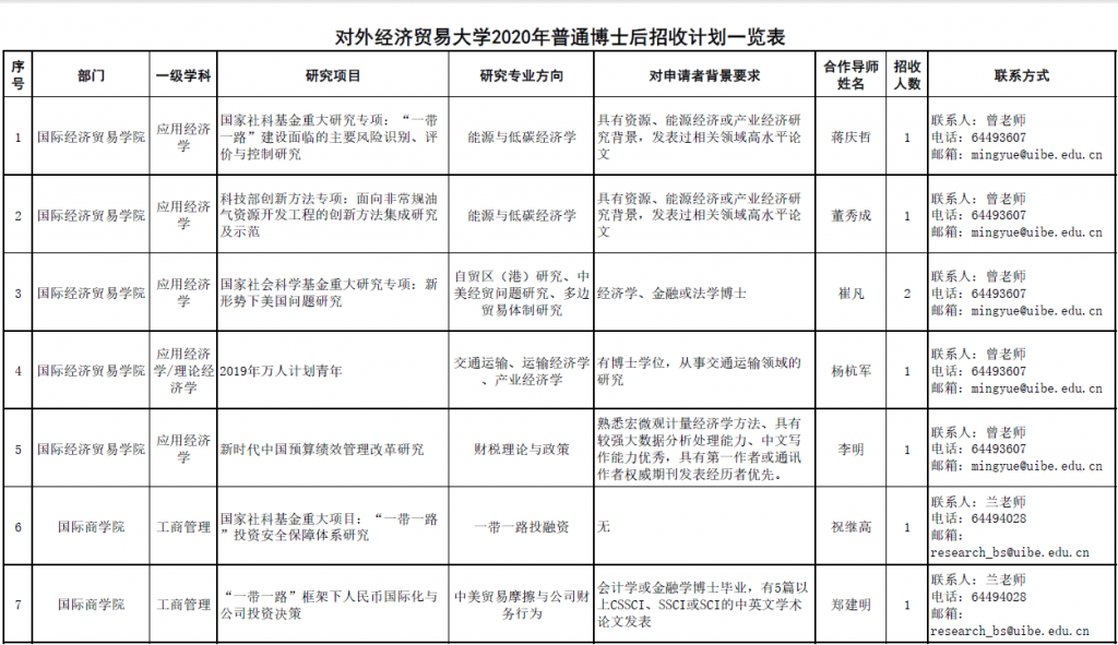 有关对外经济贸易大学2020年普通博士后招聘的详细信息,请访问该校官网查询。