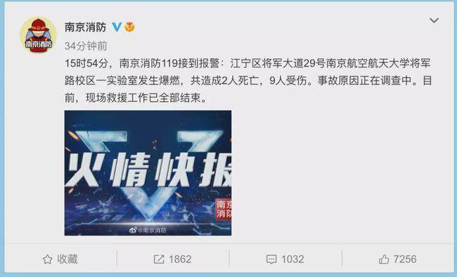 随后,@南京航空航天大学 就此事发布通报:10月24日15时52分,我校将军路校区材料科学与技术学院材料实验室发生爆燃,引发火情。当地消防救援站第一时间到达现场进行处置,及时扑灭明火。学校第一时间将11名受伤人员送往医院救治,其中2人经抢救无效死亡。具体原因正在调查中。
