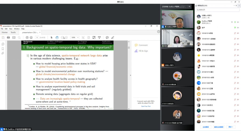 2022年4月14日下午4点,英国南安普顿大学卢祖帝教授做客中南大学商学院经管学术论坛第188期,在线为我院师生带来了题为Exploring Spatio-temporal Network Lag-interactions: a Data-driven Semiparametric Modelling的主题讲座。讲座由商学院副院长危平教授主持,邓超教授、王雄副教授、任晓航副教授等老师与各年级硕博士研究生共计260余人参加了本次讲座。
