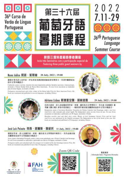 线上公开讲座向大众免费开放,葡萄牙语作家José Luís Peixoto、Nuno Júdice和Adriana Lisboa将分别以《21世纪首批葡萄牙小说家》(7月11日,19:00)、《诗歌是什么》(7月20日,19:00)及《文学与自然界》(7月29日,19:30)为题演讲。有兴趣人士届时可登入以下网址参加:https://umac.zoom.us/j/93170073369?pwd=ZlRwcjcraDBLQzA4UUtjYzliSzUxQT09 .,与作家直接互动和对话,加深对葡语文学和文化的了解。