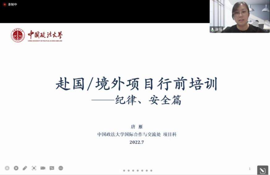 随后,学校国际合作与交流处项目科科长唐雁老师在领事保护与安全问题上为大家作出提示。在外事纪律上,她强调要维护国家利益与民族尊严;遵守当地法律法规;维护学校声誉;尊重当地风俗习惯。此外,她还在海外安全风险、海外安全常识以及海外风险防范等问题上进行提醒,并讲解了后疫情时代的境外安全常态及防控注意事项。