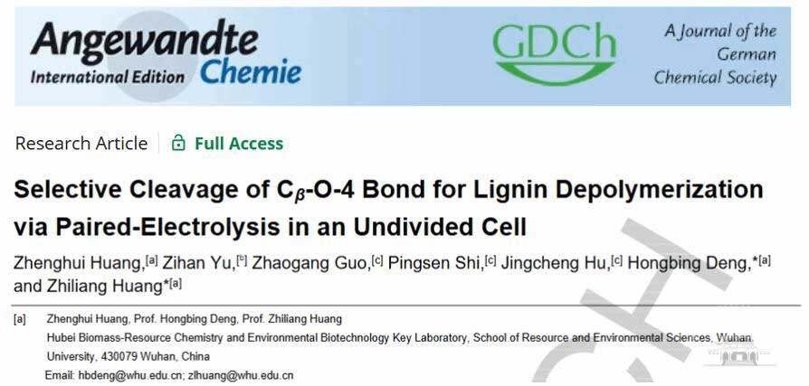 论文题目为“Selective Cleavage of Cβ-O-4 Bond for Lignin Depolymerization viaPaired-Electrolysis in an Undivided Cell”(《配对电催化木质素Cβ-O-4选择性断裂》)。资源与环境科学学院2022级博士研究生黄争辉为第一作者,黄志良教授和邓红兵教授为论文通讯作者,武汉大学为第一署名单位和通讯作者单位。