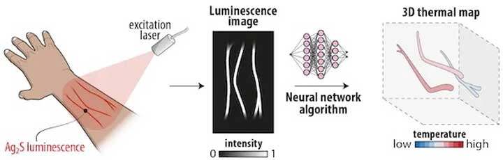 这种探测方法基于荧光纳米温度计,采用尺寸极微小的硫化银(Ag₂S)颗粒。受到光学激发时,这些颗粒会发射近红外光,发光颜色与强度取决于颗粒温度和光线所需穿透的生物组织厚度。