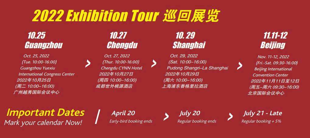 2022中国国际教育展将在广州(10月25日)、成都(10月27日)、上海(10月29日)、北京(11月11-12日)四个城市巡回展出。