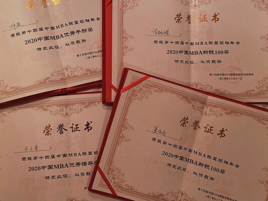 在本届论坛上,我校管理学院收获颇丰,获得多个奖项:于小青老师荣获“2020中国MBA优秀指导老师奖”;2020级MBA许康同学荣获“2020中国MBA优秀干部奖”;2020级MBA李颖琪、姜佳雨同学荣获“2020中国MBA新锐100奖”。