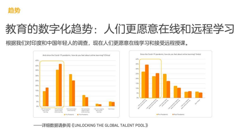 在后疫情时代,人们更愿意在线和远程学习,而早已形成的数字化教育趋势受新冠疫情催化大幅加速。报告中对中国和印度两个国家年轻群体的调查显示,中国及印度两国在新冠疫情全球大流行开始前,就已有半数左右的年轻人对在线学习感兴趣。在疫情开始后,中印两国中对在线学习感兴趣的年轻人比例均大幅提升。万昕介绍道:“根据报告显示,印度约50%的年轻人表示愿意在国外攻读学位,在中国这个比例甚至超过了60%。”