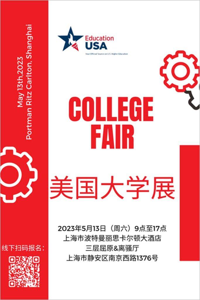 The U.S. Consulate General Shanghai is delighted to invite you to attend EducationUSA’s 2023 College & University Fair on May 13th, 2023, from 9am-5pm. The fair will be held at the 3rd Floor (Lisao I&II and Quyuan Room), Portman Ritz Carlton in Shanghai.
