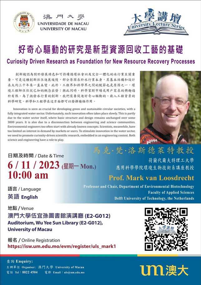澳门大学将于11月6日(星期一)举办“大学讲坛”,荷兰代尔夫特理工大学应用科学学院环境生物技术系讲座教授马克.梵.洛斯德莱特将以“好奇心驱动的研究是新型资源回收工艺的基础”为题发表演说,探讨如何激发水行业及资源回收的创新。欢迎有兴趣人士参加。