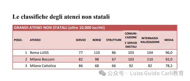 意大利Luiss大学在CENSIS 24-25排名中首次进入大规模非国立大学类别(即注册人数超过1万),并立即夺得第一名。这一优异成绩源于学校在所有评价指标上的显著提升。