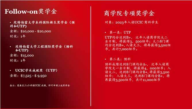 另外,针对成绩优异的在读学生,UCIC还提供价值$7,525- 9,950 UCIC学术成绩奖学金。该奖项只适用于UTP(大一快捷课程)的学生,根据学术GPA成绩,成绩优秀者自动获得,无需额外申请。申请时效和名额由院长决定。学生进入坎大大二时,该奖学金作为学费直接减免。坎大国际学院学术成就奖,可与坎大的其他奖学金重叠使用。