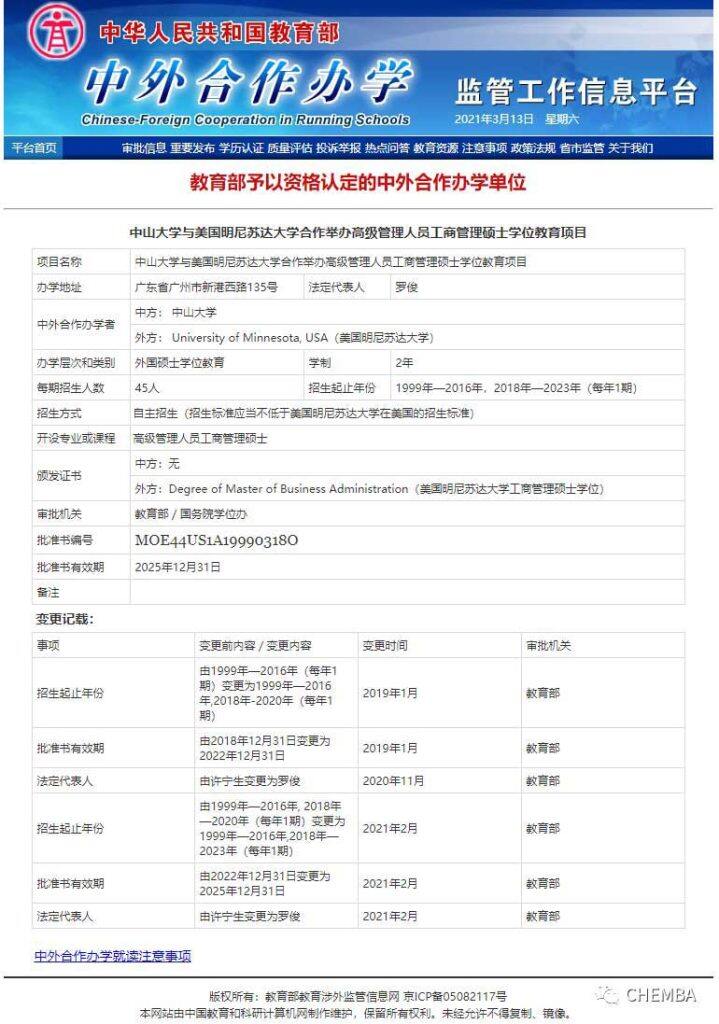 中外合作办学是我国对外交流最为深入、合作程度最高的涉外办学形式。项目扎根中国大地办学,同世界一流教育资源开展高水平合作办学,把国际教育搬到家门口,培养国际化人才,实现“不出国门的留学”。CHEMBA(China Executive MBA)项目是经中国教育部认定批准的第一批中外合作办学EMBA项目,由中山大学与美国明尼苏达大学 (University of Minnesota, USA)合作并联合培养的工商管理硕士学位教育 (批准书编号:MOE44US1A19990318O)。