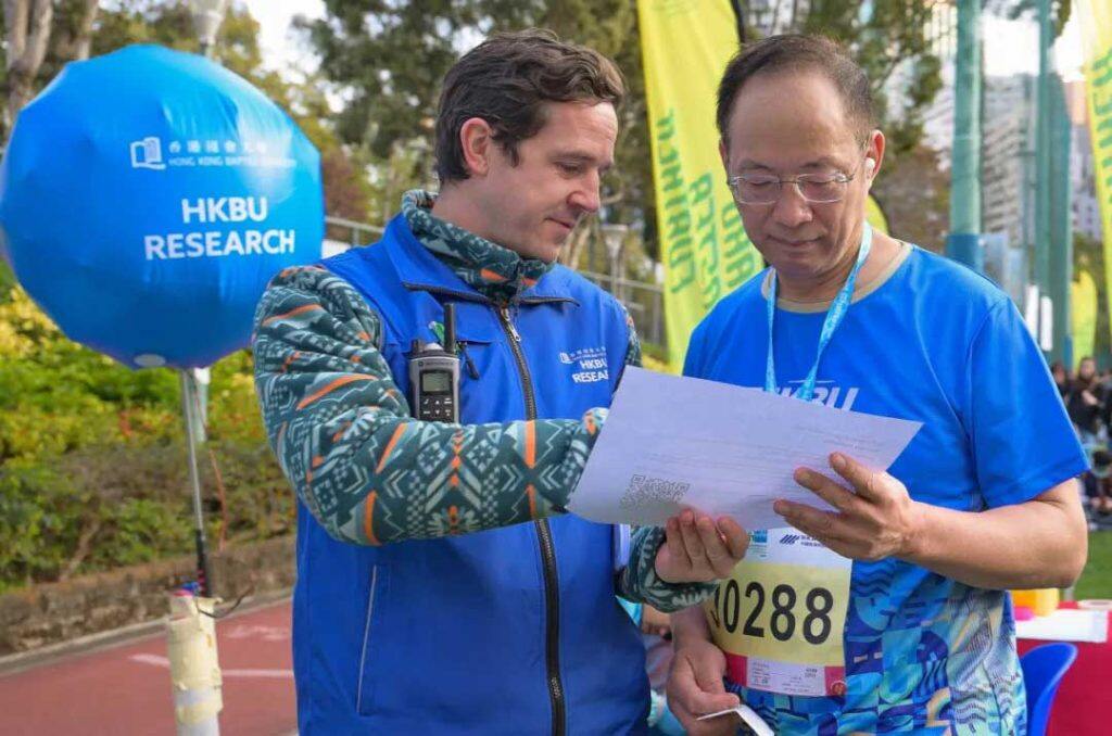 浸大校长卫炳江教授(右一)与暂任首席创新总监刘乐庭教授(左一)完成“渣打香港马拉松2025”男子十公里赛事