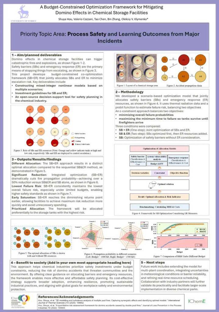 在近日英国化学工程师学会(IChemE)颁发的2025年度青年工程师创新与可持续发展奖(YEAIS)中,萨里大学博士研究生侯淑雅荣获工艺安全(Process Safety)类别一等奖!